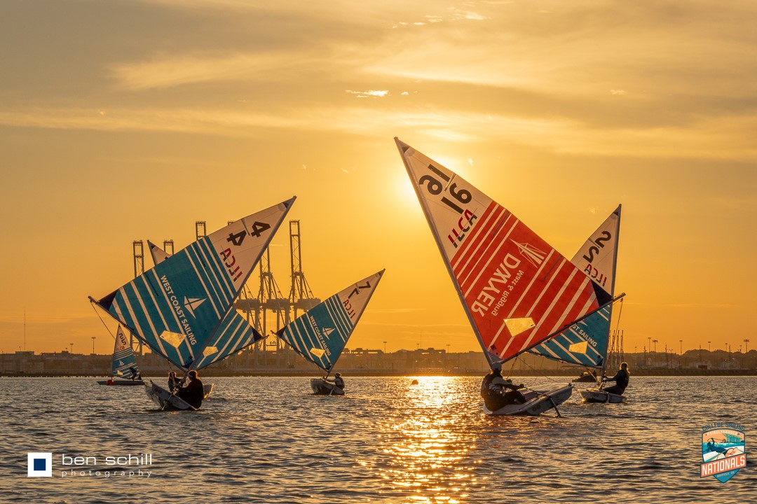 Saturday concluded with a second race at sunset, providing a stunning backdrop. Sunday began with 6–8 knots from the southwest before dropping. “It wasn’t the breeze we would expect this time of year in Norfolk,” said Mitch Brindley, head coach at Old Dominion University. “However, the variable conditions were a great test for the fleet. Having great light-air boat handling was a must.”